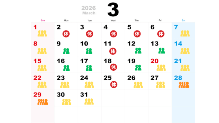 2026年3月4月の伊勢忍者キングダムの混雑予想カレンダー